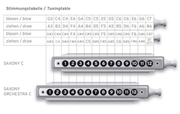 Die SAXONY Variante in ORCHESTRA-Stimmung startet mit dem g unter dem c' und läßt sich daher spielen wie eine 14-Loch Chromatic